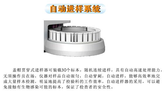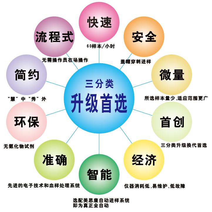 | 产品优势: | 行业唯一带自动进样三分类血液细胞分析仪,稳定性好 |