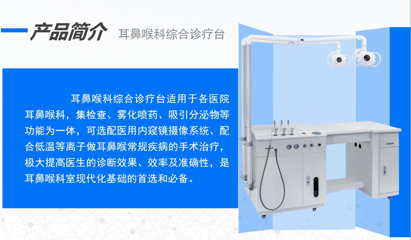 | 产品优势: | 耳鼻喉综合治疗台集鼻内窥镜、耳内窥镜、耳显微镜、显像系统、负压正压系统等于一体,用于耳鼻咽喉疾病的诊断与治疗。 |