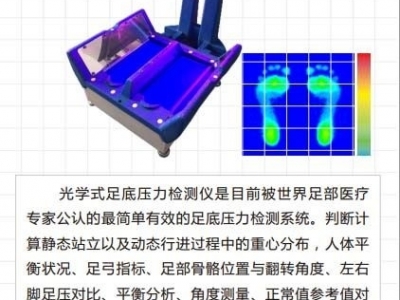 光学式足底压力检测仪,针对下肢或足部有问题的病人,提供对人体足部支撑人体重量时的压力分布进行分析:判断计算静态站立以及动态行进过程中的重心分布,人体平衡状况、足弓指标、足部骨骼位置与翻转角度、左右脚足压对比、平衡分析、角度测量、正常值参考值对比,整合了足压 / 足型 / 足底曲面一体化完整足部信息生物力学评估系统。
