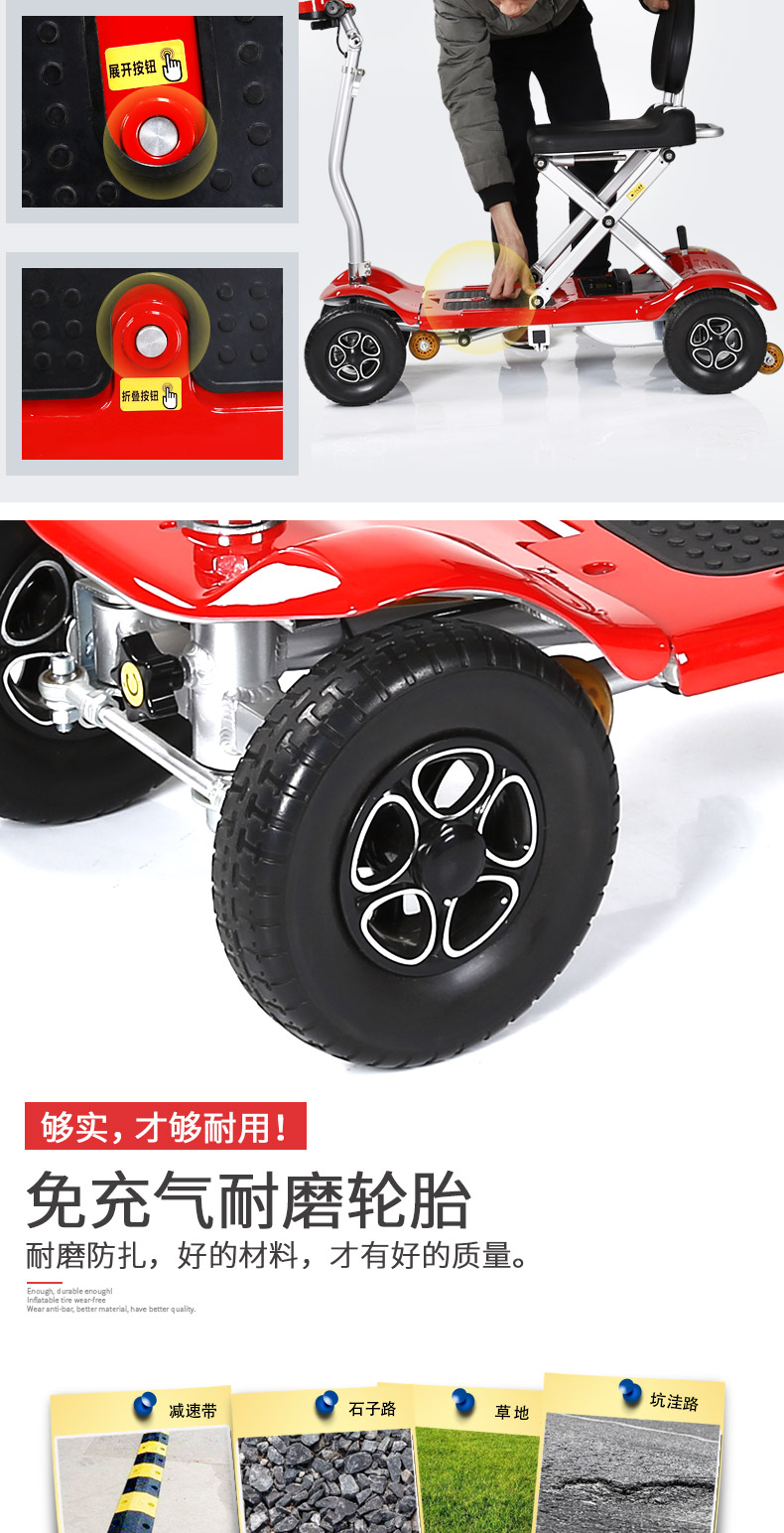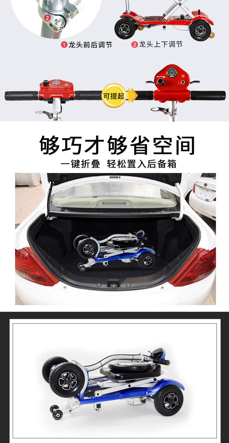24/10AH锂电池,重量轻相同体积下重量约铅酸产品的1/6-1/5;使用寿命长;能量较高,是铅酸电池的约6-7倍;绿色环保。可拆卸电池提取回家充电,直充/卸充随心充电插口。 够快,才便捷!一键3秒折叠。整车即叠即用方便快捷。 够实,才够耐用!免充气耐磨轮胎 耐磨防扎,好的材料,才有好的重量。轮胎直径长200mm,应对各种路况没有问题。 强劲承载 ,配置防倾后轮,防止后翻防倾后轮起稳定作用。 150W强劲电机轻松应对各种路况,英国PG控制器 智能芯片加速平稳,启动平稳变速流畅1000万次疲劳测试0故障,一学就会。简单易懂好操作:右手控制前进、左手控制后退、双手松开拔杆即停。更多人性化设计、拔杆往前推手动挡、往后拉电动档;龙头前后调节,龙头上下调节。 够巧才够省空间,一键折叠 轻松置入后备箱。