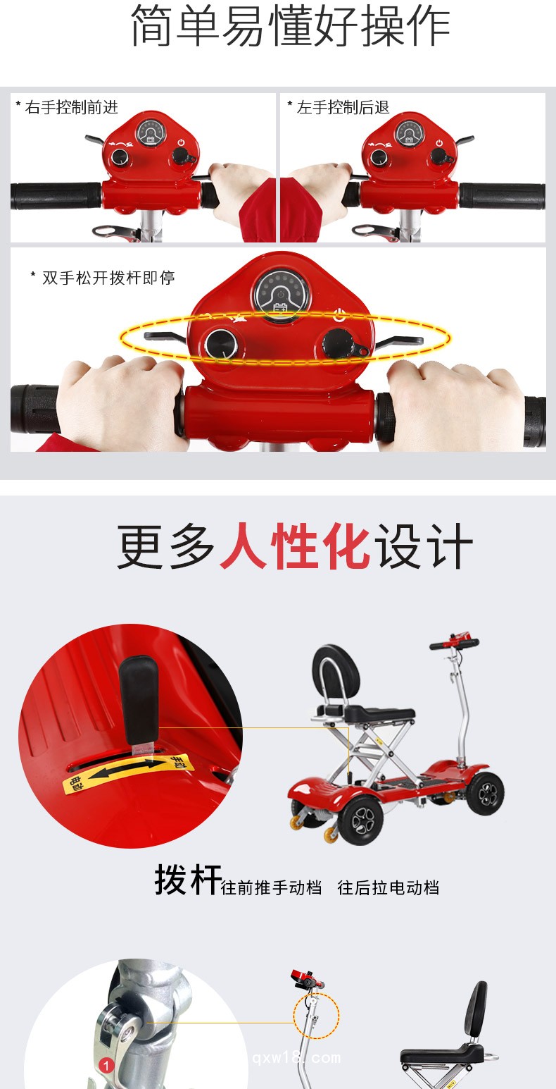 顾虑1:老人操作方便吗? 答:操作为万向操作杆,非常简单,单个手指就可以操作,360°旋转,简单易学,松手立刻停车。