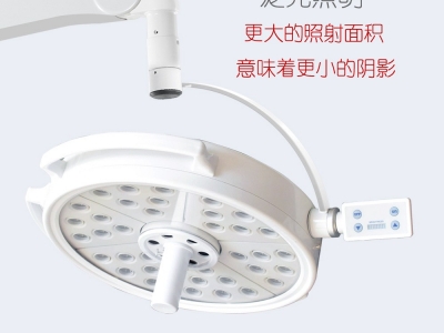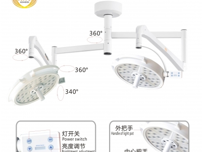 特点: 1国际品牌原装LED光源.亮度高.中心把手聚焦,亮度线性可调。 2.双把手操作,中心把手可拆卸消毒.照明深度深。 3.双灯双系统照明,一键触摸开关,亮度触控调节。 4.灯头、灯臂360°转动.定位准确无位移. 卖点: 1、灯盘小、特别适合小型手术室的手术照明。 2、价格低、投资小,创利高。 3、双灯合一照明.亮度高.照明深度深。 4、可增加CCD摄像糸统.将手术作为教材