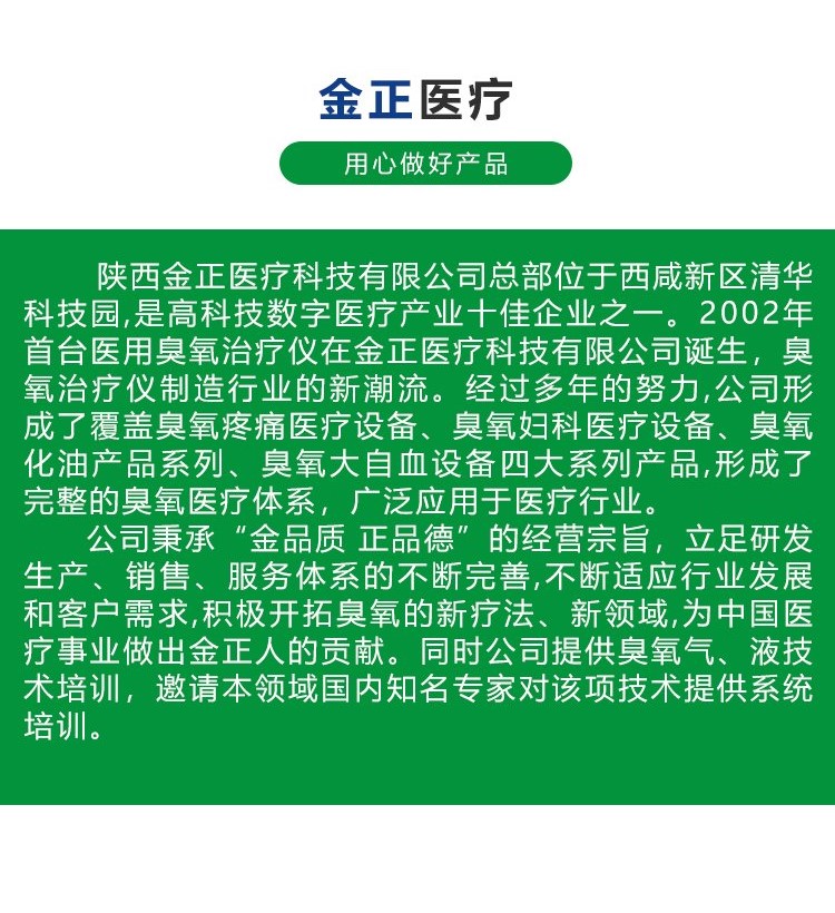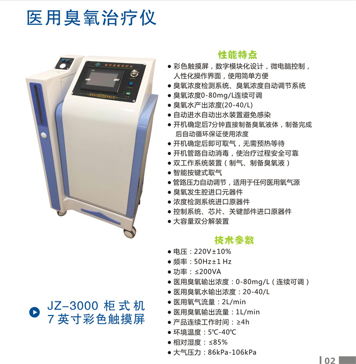 医用臭氧治疗仪JZ-3000性能特点 1、双出气装置,操作人员自行选择出气方式(自动或手动); 2、定时出气(1-9分钟连续出气),适合做臭氧水; 3、定量出气(10-950ml),适合做直肠灌注、套袋熏蒸; 4、数字设定臭氧浓度;(仪表盘显示): 5、臭氧浓度检测仪; 6、设置开机密码,方便仪器使用管理; 7、开机确定后即可取气,无需预热等待 8、开机自动系统检测; 9、开机管·自动消毒; 10、管路压力自动调节,适用于任何医用氧气源; 11、7寸彩色触摸屏,数字模块化设计,微电脑控制; 12、关键部件、原器件采用德国; 13、大容量臭氧尾气双分解装置,确保治疗室环境符合标准; 14、固定式取气装置,减少使用故障,使用更省心。 控制系统,芯片,关键部件进口原器件,自动,手动出气,定时出气,定量出气:大容量双装置