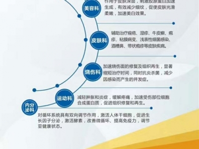 | 产品功能: | 1、具有消炎、止痛作用 2、加速伤口愈合 3、改善微循环 4、提高免疫力 5、促进细胞再生 6、抗哀老美容作用 |