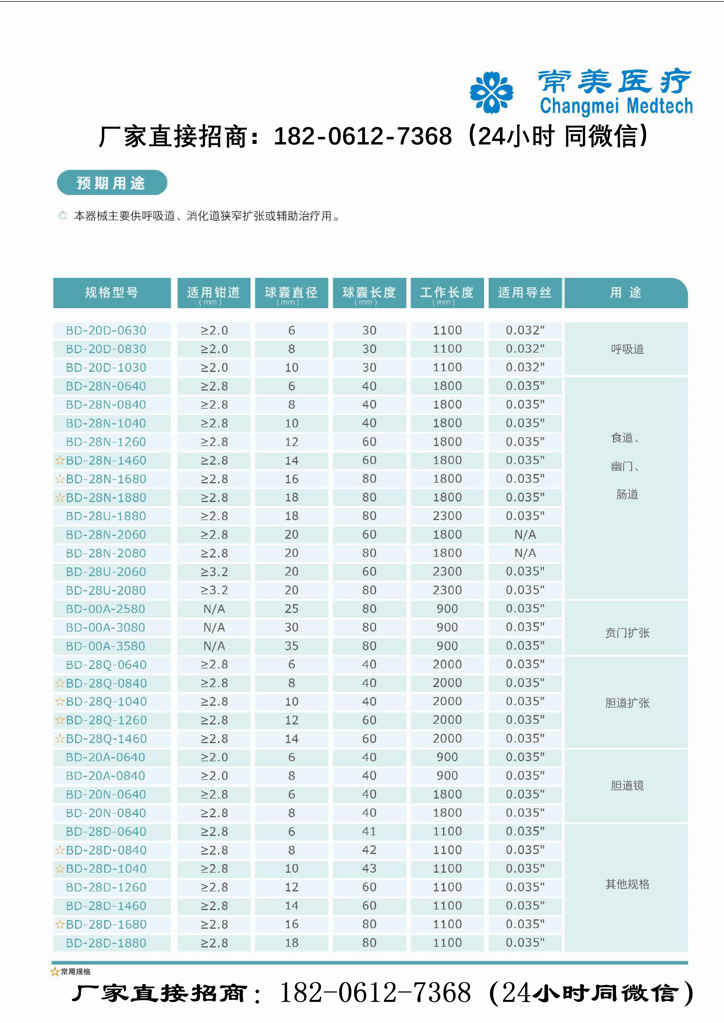 | 产品说明: | 预期用途:本器械主要供消化道狭窄扩张或辅助治疗用。 产品特点:弹性软头设计,可顺畅进入靶位,对组织损伤少;球囊高度透明,有利于对扩张过程的观察;球囊采用进口材料,耐压高,不易形变,扩张更安全;球囊采用多翼折叠、恒温定型,回复性好,便于从工作通道回撤;优化设计的导管,管壁光滑,弹性好,抗扭结性强,推送性能佳;球囊安装显影标记,X线下清晰可见,定位准确。规格表:规格型号适用钳道孔 工作长度 球囊规格*适用导丝 用途BD-28N-* ≥2.818000640、0840、1040、1260、1460、1680、18800.035in 食道/幽门/肠道球囊 BD-28U-*≥2.82300 18800.035in BD-28N-*≥2.81800 2060、2080 N/ABD-32U-*≥3.22300 2060、2080 0.035in BD-00A-*N/A900 2580、3080、3580 0.035in 贲门扩张球囊BD-28Q-* ≥2.8 2000 0640、0840、1040、1260、1460 0.035in 胆道扩张球囊 BD-20A-* ≥2.0900 0640、08400.032in 胆道镜球囊 BD-20N-* ≥2.01800 0640、0840 0.032in BD-28D-* ≥2.81100 0640、0840、1040、1260、1460、1680、1880 0.035in 其他规格球囊 单位:毫米
