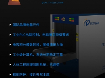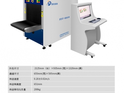| 产品说明: | FDT-SE6550型(012目录 入围型号)X射线安全检查设备广泛应用于:大楼、科研机构、机场、地铁、看守所、学校考场、大型活动、体育展馆、公路铁路客运、车站码头、海关港口、大使馆、旅游景点、等公共场所的安全检查。 通用指标外形尺寸: 2125(长)×935mm (宽)×1320mm (高) 通道尺寸: 655mm(宽)×505mm(高) 传送速度: 0.20±0.02m/s 传送带高度:651mm 传送带均匀负重:200kg 重量:395Kg 储藏温度 / 相对湿度:-40℃±3℃~+60℃±2℃ / 5%~95%(不结露) 运行温度 / 相对湿度:0℃±3℃~+40℃±2℃ /5%~95%(不结露) 电源: AC220伏(-10%~+10%),50Hz±3Hz 功耗: 0. 5kVA基本指标X射线发生器穿透力:38mm钢板 线分辨力:40AWG 穿透分辨力:34AWG 空间分辨力:水平 Ф1.0mm 垂直 Ф1.0mm 通过率:720个/h 单次检查剂量:≤3.0μGy 泄露射线剂量率:<1.0μGy/h 系统噪音:54dB(A)射线束方向:底照式(从下往上) 管束压:80~160kV可调 管束流:0.1~1.2mA可调 冷却方式 / 运行周期:密封式油冷/ 射线束发散角:60°图像处理系统X射线传感器:多能量L形光电二极管探测器 有机物显示为橙色,无机物显示为蓝色,混合物显示为绿色 显示器:17寸飞利浦高清液晶显示器功能图像处理功能: 彩色/黑白、有机物/无机物(剔除)、超级增强、边缘增强、局部增强、灰度扫描、图像恢复、反向显示、连续放大、局部放大、高能/低能穿透、图像回拉、图像保存(大于10万幅)等 辅助功能: 一键关机功能、穿不透报警\辅助探测功能、上电自检等 根据人体工程原理设计专用键盘、图像显示及人机交互界面,有效提高设备的易用性 支持专用图像格式转换,可转换为JPG、BMP、GIF等通用图像格式;同时支持图像转存至USB存储设备 采用模块化设计,并提供X射线源、探测器阵列、专用键盘等关键部件的测试诊断功能,使设备故障诊断及维修更加准确和快捷品质国际品牌电器元件 工业PLC电路控制,电磁兼容特级要求 电容积分模数转换,图像清晰入微 工业级计算机,系统长期稳定可靠 人体工程原理阅图系统 辐射防护:接近空气本底外形尺寸