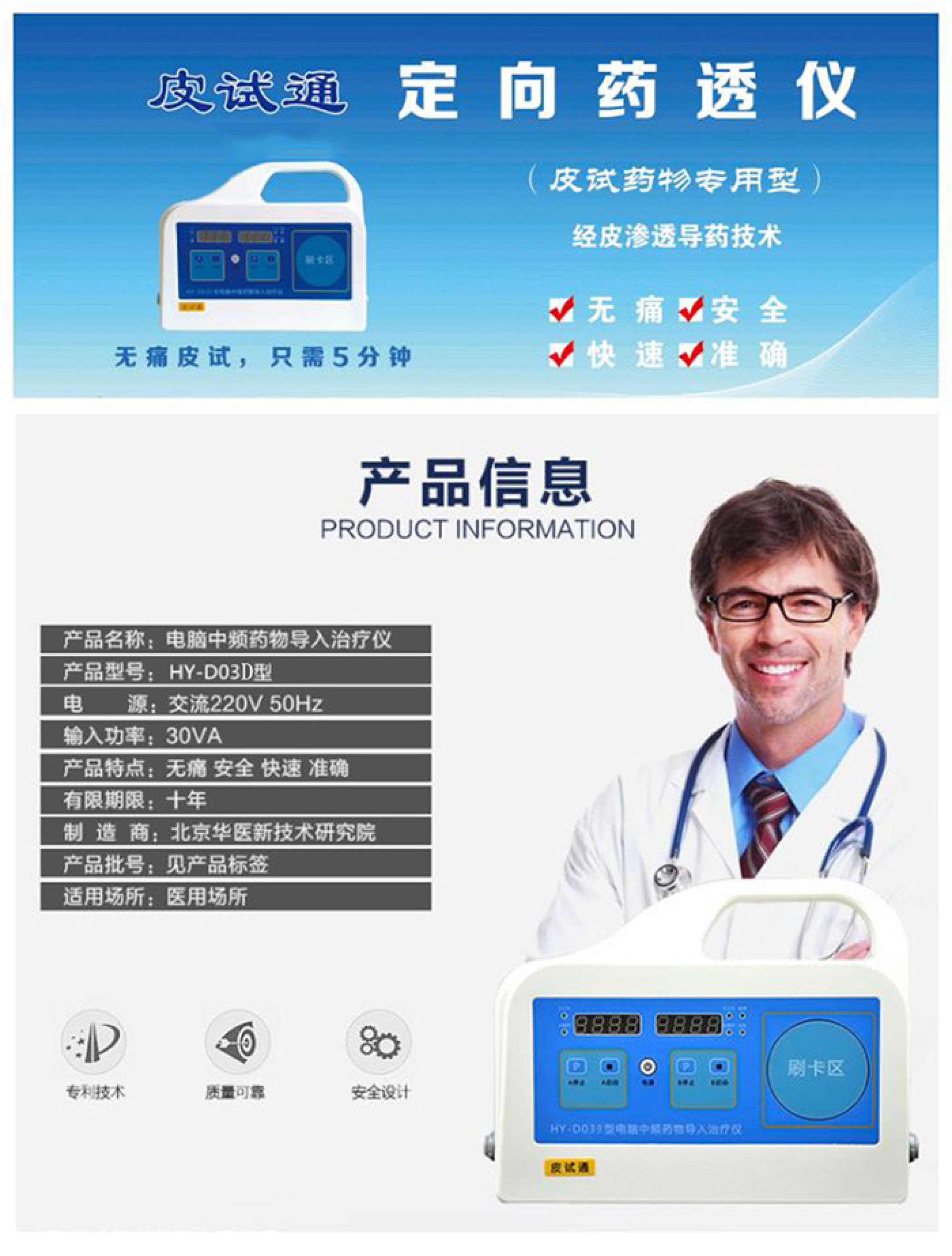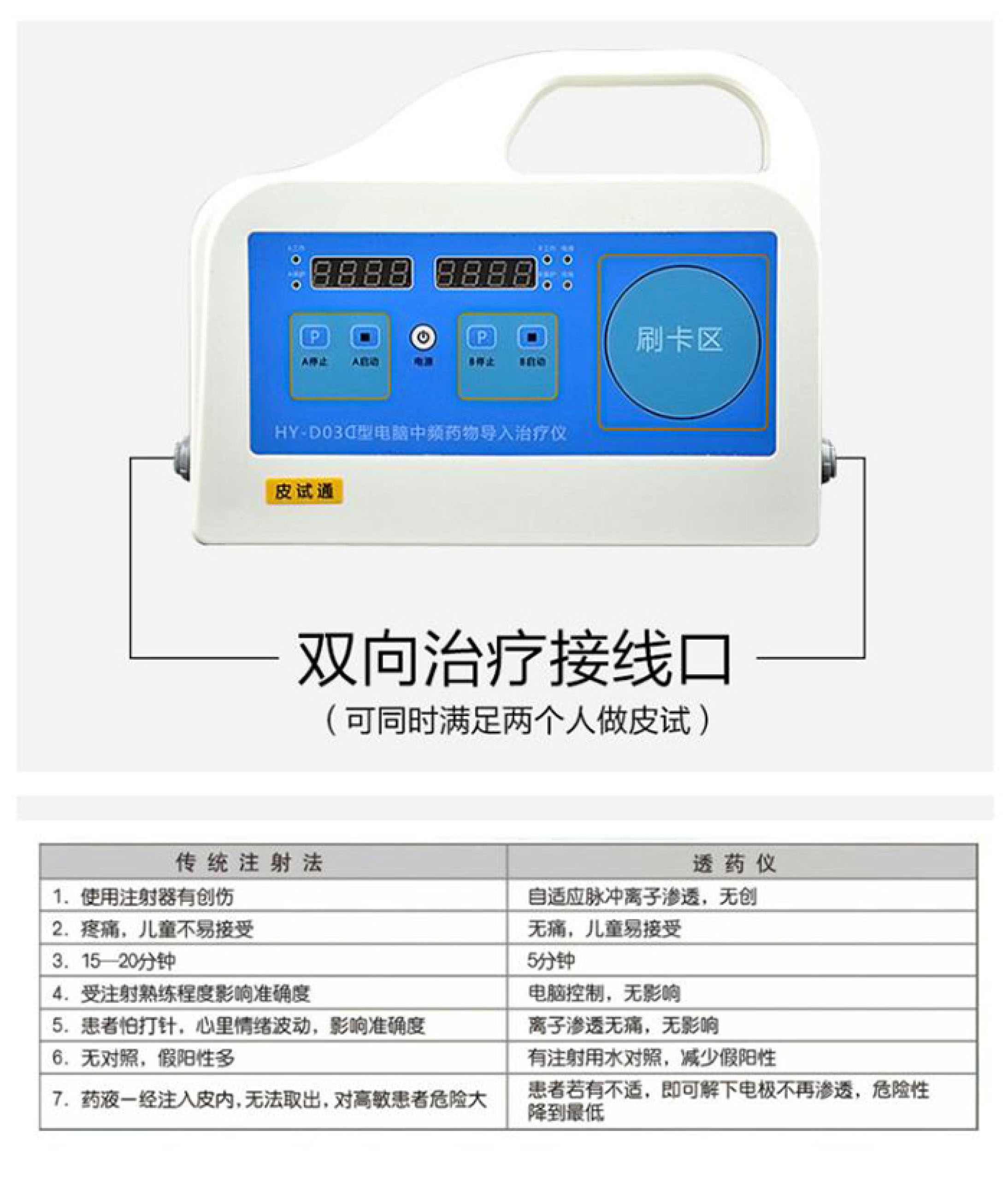 HY-D03D型中频药物导入治疗仪(皮试通)的技术上走在创新的前端,采用非对称中频电流定向透药经皮渗透技术。与现有的青霉素皮试仪采用直流电离子导入,在技术上有着本质的区别,其安全性、便利性、合法性在临床上得以被越来越多的医护人员认可。