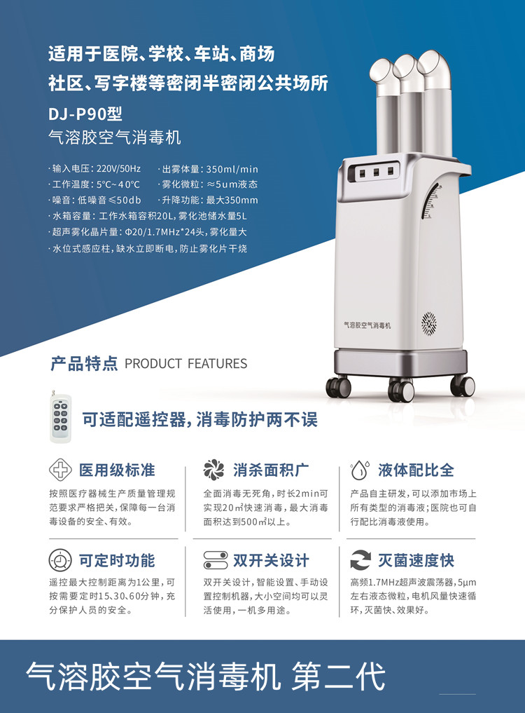 气溶胶是液态或固态微粒在空气中的悬浮体系。常规气溶胶的消除,主要靠大气的降水、小粒子间的碰并、凝聚、聚合和沉降过程。因人类活动产生的气溶胶,必须经过专业的气溶胶消毒机来进行消杀灭菌,防止病毒传染。 达到极高数量级的阈值,部分病毒才能由黏膜进入人体。像在密闭空间或空气流通条件不好的地方,气溶胶传播病毒的风险较高。因此,防范新冠病毒的气溶胶传播,需要通过消毒机降低病毒的浓度和活性达到下沉效果。 日常开窗通风、空气净化器等方法,对稀释病毒浓度有一定帮助,但不能做到100%。所以要想隔绝病毒需要借助专业的空气消毒设备。 煜博气溶胶(过氧化氢)空气消毒机全线升级,新增远程开关控制功能,启动停止、定时功能、雾化量控制、烟管升降控制均可灵活操作 气溶胶空气消毒机必要性: 随着科技的不断发展,来自自然界、医院、化工企业等空气环境的污染物的不断增加,尤其是近年来各种易传染的病毒的传播,使得医院的环境逐步恶化,随着医院感染控制程度的增强,对医院、诊所室内消毒越来越高。 气溶胶空气消毒空气机就是针对现在日益恶化的医院环境而研制出来的。它可在短时间内轻松实现局部空间的无尘无菌,让有害病菌和污染的空气远离医务人员及病员。 气溶胶空气消毒机技术参数: 1.产品采用特殊设计的医用级分散系统,纳微米级液珠直径≤5um。 2.不需要空气压缩机做为动力,采用超声雾化原理,避免产生巨大噪音。 3.低噪音,≤50db。 4. 工作水箱容积20L,雾化池储水量8L。 5. 消毒方式:消毒剂成分为过氧化氢,更安全;也可采用次氯酸水、酸性氧化电位水作为消毒剂 6.超声雾化晶片:Ф20/1.7MHz*24头,雾化量大。 7消毒剂使用量少,仅6-10ml/m3,材料兼容性好,无残留、无腐蚀。 8.可调节式出风口,全方位消毒无死角。 9.生产企业具有ISO9001质量管理体系证书。 10.涡轮驱动纳微米液珠,可达30m3/min. 雾化水位:35mm