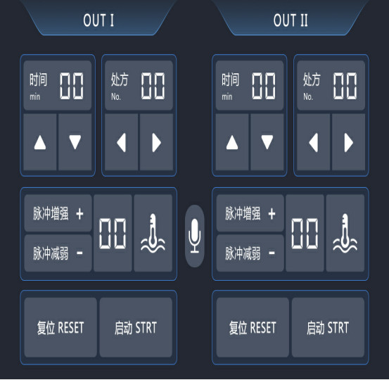 产品功能: 热疗功能:热疗带或皮肤发热电极里有红外线发热功能,在使用时,温度保持在40℃——60℃之间。通过红外线和针灸作用,促进血液循环、血流加上,体内毒素渗出,达到驱寒祛湿,散瘀活血止痛之功效,促进致痛物质的分解和转化,有明显的止痛作用。 药物导入:热疗带或皮肤发热电极片上加上对病症有针对性治疗的药水,贴敷在病灶部位,通电治疗,有药物导入功能。具有明显降低人体阻抗,在强脉冲频率,电池效应的作用下,把中药药液分解成药离子,再通过仪器的独有功能:无针针灸、红外线和热疗等作用,增强了生物膜的渗透性,将大剂量的药离子渗透到人体较深的病灶部位,有效的促进血流循环,有即刻止痛的功效。 操 作 面 板