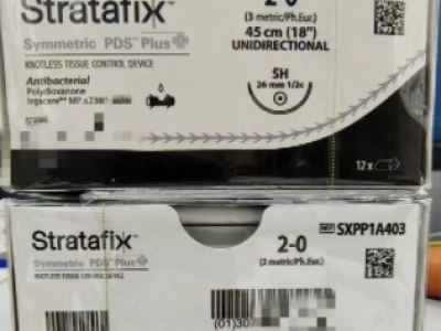 【产品结构及组成】:缝线是由Polydioxanone材料制成的带单向锚钩无菌可吸收性单股缝线。一端连有一个手术针,一端连有一个固定翼片。由于采用了锚钩和固定翼片的设计,在组织缝合时无需打结。缝线上含抗菌物质三氯生,只用于抑制细菌在缝线上的定植。该产品无涂层,手术材质为美国标准牌号420(对应中国牌号30Cr13)以及爱惜康不锈钢合金ETHALLOY。固定翼片与缝合线材质一致。
