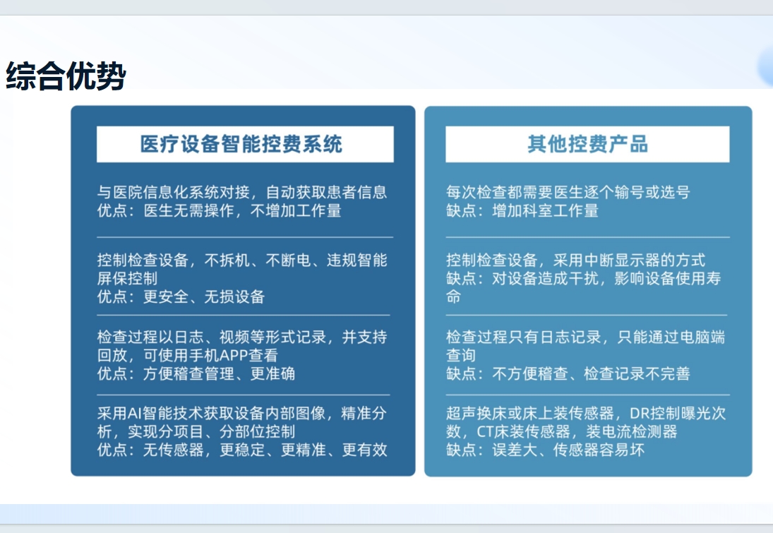 | 产品说明: | 一、漏费现状 1、漏费问题的严重性 医院漏费现象对医院的经济运营产生了显著影响。据相关行业调研,部分医院因漏费问题导致每年经济损失可达数百万甚至上千万元。这些漏费情况不仅直接减少了医院的收入,还影响了医院对医疗资源投入的规划。 2、常见的漏费形式 人情检查与治疗、小收费做大检查、设备私自使用等 3、医院采取的应对措施 科室门口安装摄像头 缺点:人工核对,管理工作量大 人员盯防 缺点:主动管理、数据核对复杂 举报电话 缺点:被动管理、监管效果不佳 传统防漏费系统管理 缺点:技术落后,管控时间短 二、和之风V6.0医疗设备智能控费系统介绍 和之风医疗设备智能控费系统v6.0是由软件和硬件相结合进行设备控制的。采用了计算机应用系统、智能图像识别算法技术、生物特征识别技术,医疗设备影像传输等高新技术相结合,对检查过程实时动态监测患者检查中多数据、多维度综合管理,精准识别患者检查缴费项目、检查次数、严格区分人员差别。彻底告别传感器控制。 系统采用B/S架构支持云端部署、集团化部署、本地单机部署。保证了系统功能强大,灵活、人性化,数据处理效率高,且稳定、可靠,升级、扩容便捷;远程维护方便快捷,无成本。 和之风智能控费系统v6.0前端对接医院信息化系统(HIS、LIS、PACS、体检系统),后端通过标准化接口,采用串口通信、网络传输,引进人脸识别算法与人体识别感应、图像采集分析处理及智能屏锁等技术与医院检查检验设备一对一 对接,医生工作流程不改变。不剪线、不拆机、不断电源,实现“无损”控制,“无感”操作。 三、和之风V6.0医疗设备智能控费系统优势 传统防漏费控制方式弊端: 1、科室任务量重、又增加设备操作者工作量,控费系统不容易落地实; 2、侵犯患者隐私,传感器误差大、并容易损坏,外挂屏不清晰,影响写诊断报告; 3、医院检查检验设备比较昂贵、拆机增加损坏风险; 4、系统日志记录不完善、不准确,无法精准判断是否违规;
