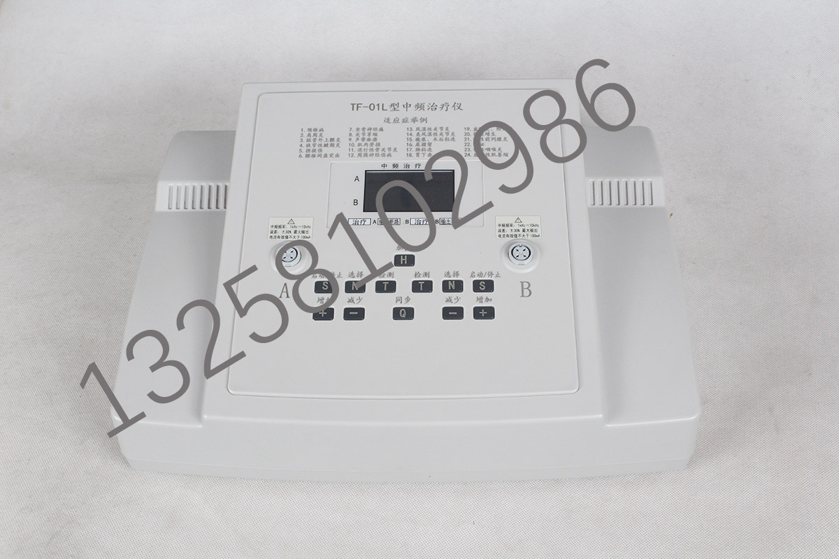 TF-01L型中频治疗仪功能特色: ◆本产品适用于各级医院、诊所、体验店、美容店使用。 ◆输出断路预警功能、产品输出断路,黄色指示灯亮;输出断路故障排除,黄色指示灯灭;同时可预防电击患者现象发生。 ◆电极板、连接线检测功能 利用“输出断路提示"和“检测"按键可自行判断电极板和连接线的好坏。 ◆2个通道独立输出,互不干扰。 ◆连接线和主机可手动紧固,防止治疗过程中连接线意外脱落。 ◆内存24个治疗处方,加温温度四挡可调。 ◆标配大中小三种尺寸电极,满足不同部位治疗需求。 ◆标配长度为1米的随处沾固定带4套,解决不同部位固定难题。 ◆根据医生指导,使用前在患处涂抹外用药,治疗时开启加热功能,可加速药物分子的热运动(渗透功能,可配合各类粘剂使用)