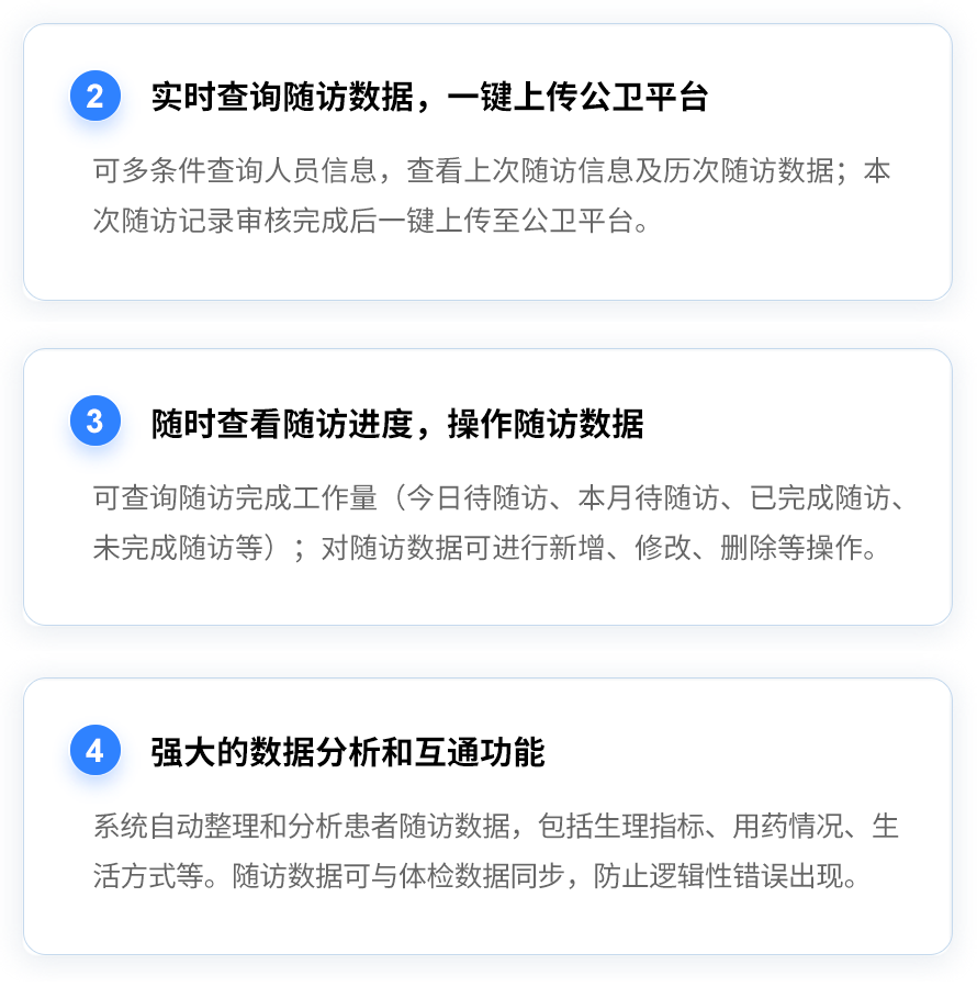 | 产品优势: | 秒速建档,高效随访,数据一键上传 |