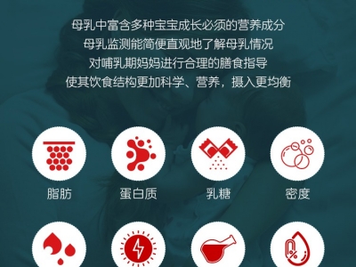 | 产品用途: | 对产后妈妈进行营养指导,为宝宝提供更加全面的营养。用于检测初乳、过渡乳、成熟乳、晚乳各阶段乳汁中的营养成分含量,分析乳汁中的脂肪、蛋白质、乳糖等营养因子及成长因子含量。根据乳汁情况为哺乳期女性提供个性化科学的营养膳食指导方案,是现代乳母合理膳食的金标准, 帮助哺乳妈妈给宝宝提供最健康的奶水,促进宝宝健康成长。 |